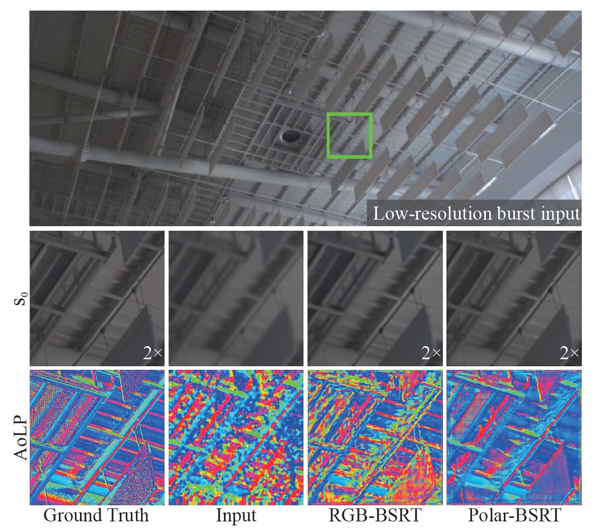 The top row displays the low-resolution burst input captured using a polarization camera. The second row presents closeup comparisons of different methods: GT, the low-resolution input, the 2× super-resolution results of the RGB-trained BSRT trained on a conventional RGB dataset, and the Polar-BSRT method trained on our polarization image dataset. Training with our dedicated polarization dataset significantly improves both the spatial resolution of the intensity image (s0) and the angle of linear polarization (AoLP) map, demonstrating the importance of polarization-specific training for burst super-resolution.